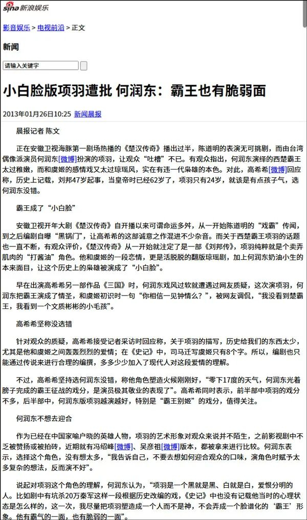 2013年年初的一篇报道写道,有观众评价,项羽被何润东演成了“卖弄肌肉的小白脸”,和虞姬的情感戏像“翻版琼瑶剧”,和虞姬初识时一句“你相信一见钟情么?”,被网友调侃,“我没看到楚霸王,我看到一个文质彬彬的小毛孩。”