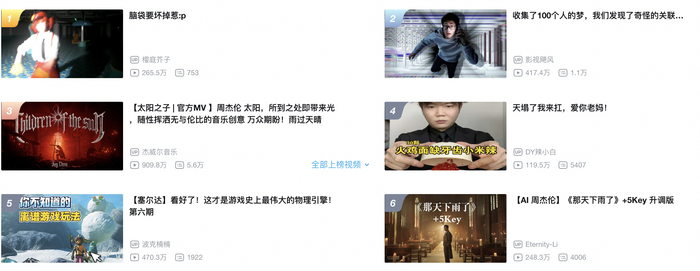《太阳之子》发行当天,各大平台涌现大量的AI作品。B站上,AI 升调改编版《那天下雨了》甚至与《太阳之子》官方 MV 一同登上全站排行榜,播放量高达 248.3 万,形成了有趣的同台对峙。
