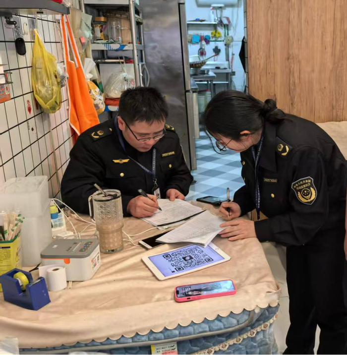 在钦州路、厦门路等外卖餐饮密集区域,执法人员逐户核验营业执照、食品经营许可证的有效性,比对线上公示信息与线下实体的一致性。