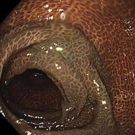 正常的结肠黏膜就像口腔黏膜一样,是淡红色的,看起来光滑平坦,黏膜表面的小血管纹理清晰可见。