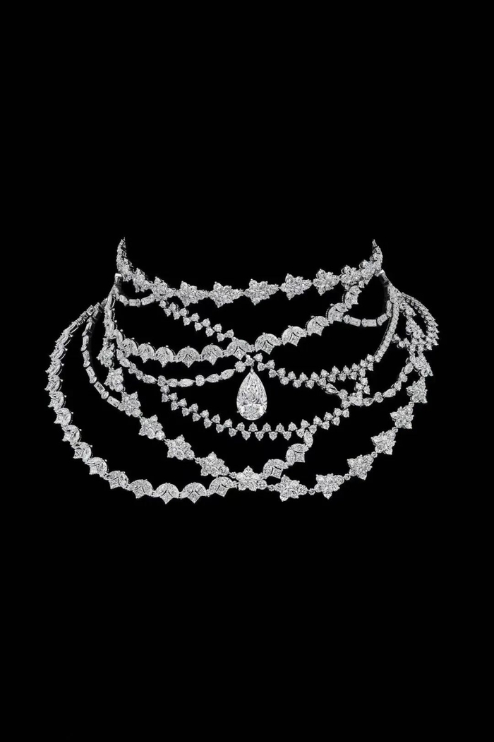 有两件珠宝我稍微介绍一下,一件是来自Dior Délicat系列的白金项链,主石依旧是水滴形切割钻石,圆形、榄尖形、阶梯型等琢形钻石层叠交织。