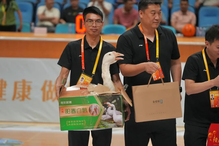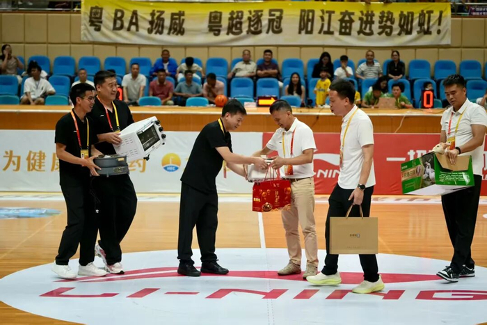 中场休息环节,双方互赠“广货”。阳江队送上春砂仁、坚果礼盒和阳春白鹅,湛江队则回赠电饭锅、电火锅、电烤箱等小家电。一份份地道的家乡特产,传递着两座城市之间的深厚情谊。
