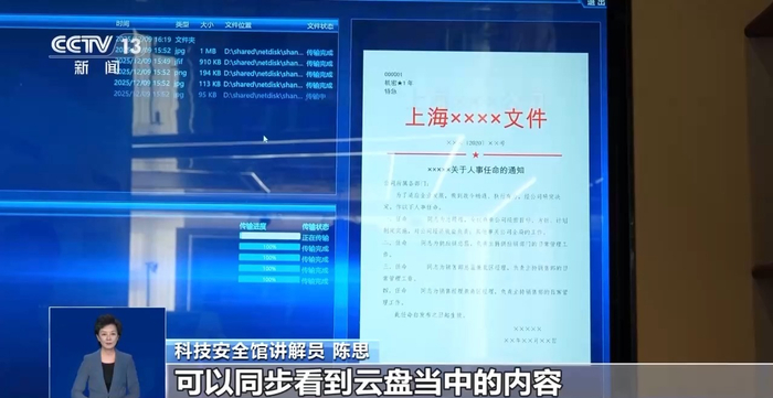 “云端”不是“保险箱” 便捷背后有风险近年来,随着网络“云”功能不断普及,“云端”数据也被境外间谍情报机关盯上,像邮箱、云盘一旦被攻破,究竟会有多危险?继续来看记者的调查。科技安全馆讲解员 陈思:我们现在演示的是邮箱失密的风险,我们在被植入木马病毒的电脑上打开邮箱,我们看到已经登录完成了,实时同步的,还有黑客监控端的画面,你可以看到每一封邮件都已经完成了传输,所以它的窃取是同步实时的,我们来做个小实验,您可以向邮箱当中发一封邮件,看它是不是能收到。记者:我来发一个内部产品简介,然后现在点击发送。科技安全馆讲解员 陈思:邮箱已经收到了,您可以再向监控端看,同样它也收到了内部产品简介。 科技安全馆讲解员 陈思:我们来演示一下云盘的窃密,当我们打开,登录账号密码的时候,可以同步看到云盘当中的内容,涉密文件也被黑客窃密端所看到,它也可以进行传输,而且可以拷走这些文件。无论是邮件收发,还是云端存储,看似高效便捷的线上办公,一旦疏于防范,就会成为失泄密的“重灾区”。 近年来,国家保密行政管理部门公布了多起违规云存储国家秘密的案例,相关责任人在未经保密审查的情况下,将涉密资料上传至网络,事后均依纪依法受到严肃问责处理。比如,某省直单位工作人员李某,利用自己的网盘私自保存机密级涉密资料。某县级机关工作人员杨某为方便工作,擅自将收集到的包括1份机密级文件、2份秘密级文件在内的大量文件资料上传至某网盘,并回家下载使用。记者 王莉:面对云存储账户易遭非法网络攻击等风险,在日常工作生活中使用互联网处理个人事务时,需从操作层面加强相应安全防护。
