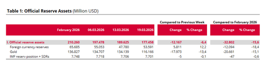 土耳其央行的周度数据清楚地勾勒出了这张图景:3月13日至19日,黄金储备市值从1341亿美元暴跌至1162亿美元,单周蒸发近180亿美元;而同期外汇储备(不含黄金)反而回升了58亿美元。