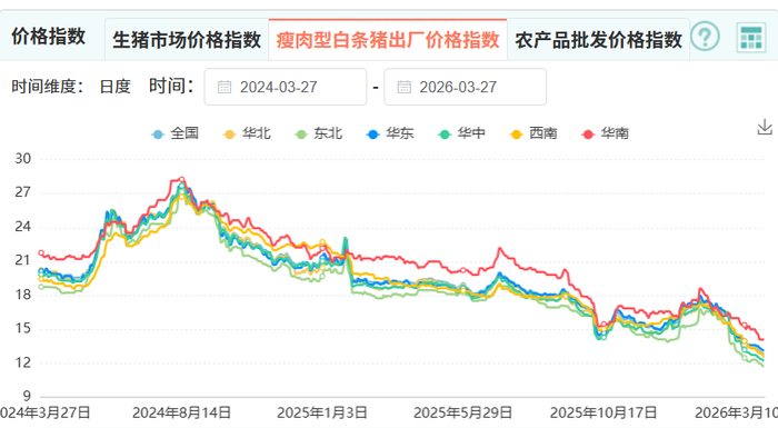 农业农村部全国重点农产品市场信息平台数据显示,截至3月27日,瘦肉型白条猪出厂价格指数已降至2024年同期以来新低。
