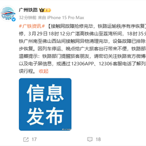 经铁路部门全力抢修,3月29日18时12分广湛高铁佛山至荔湾所间,18时35分南广高铁、贵广高铁广州南至佛山西站间接触网异物清理完毕,设备故障已排除,列车运输秩序正逐步恢复。因列车停运、晚点给广大旅客出行带来不便,铁路部门表示歉意。