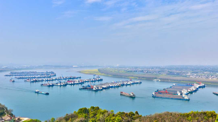 3月28日,湖北枝江长江水域晴光正好,宽阔江面上数百艘货运船舶依次列阵,静候调度。