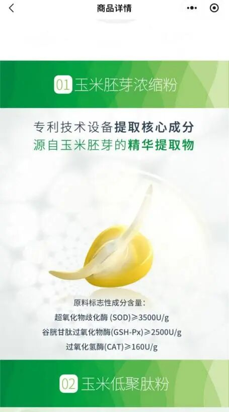 在“未来生物官方商城”微信小程序中,玉米胚芽粉的产品详情页显示,其配料表包含乳糖醇、玉米胚芽浓缩粉、玉米低聚肽粉、γ-氨基丁酸、食品用香精、二氧化硅等成分。产品介绍中特别提到,该产品从玉米胚芽中提取出三种活性酶:至少含超氧化物歧化酶(SOD)3500u/g、谷胱甘肽过氧化物酶(GSH-Px)2500u/g、过氧化氢酶(CAT)160u/g。