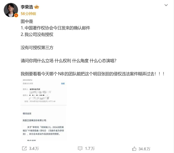 3月29日,歌手李荣浩发文称,自己曾拒绝歌手单依纯的版权邀约,但单依纯仍在28日深圳演唱会上强行侵权演唱其曲作《李白》。