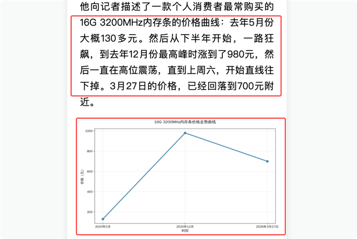 “昨天到今天,一款主流的 16G 内存条又掉了四五十块。上周六那天更夸张,一天就掉了一百多块。”