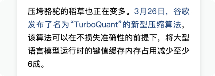 另外还有一件事,原报道中提到的谷歌 TurboQuant 压缩算法