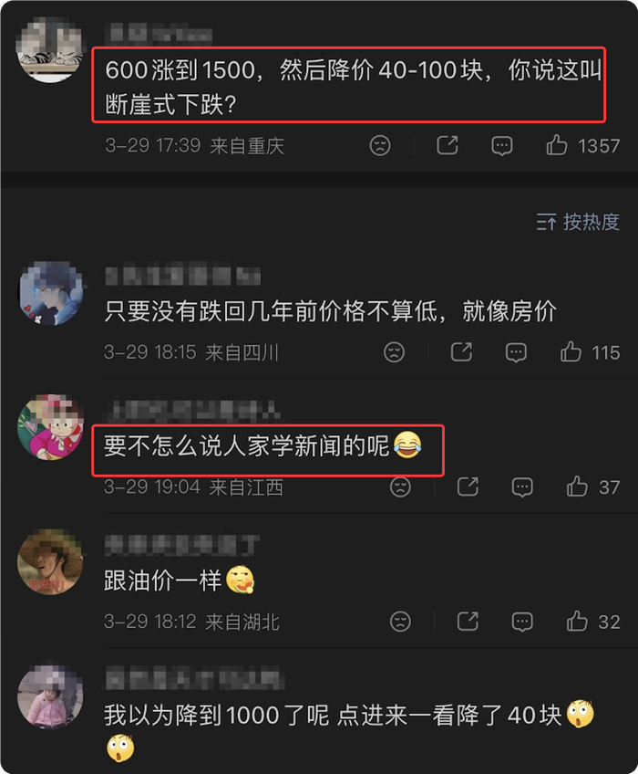 该微博热评第一 1300+ 赞:600 涨到 1500,然后降价 40-100 块,你说这叫断崖式下跌?
