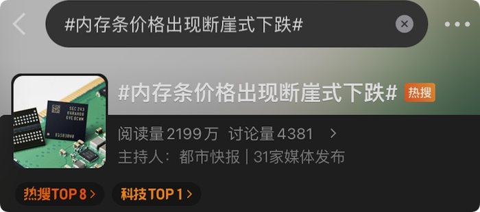 29 日科技热搜第一:「内存条价格出现断崖式下跌」