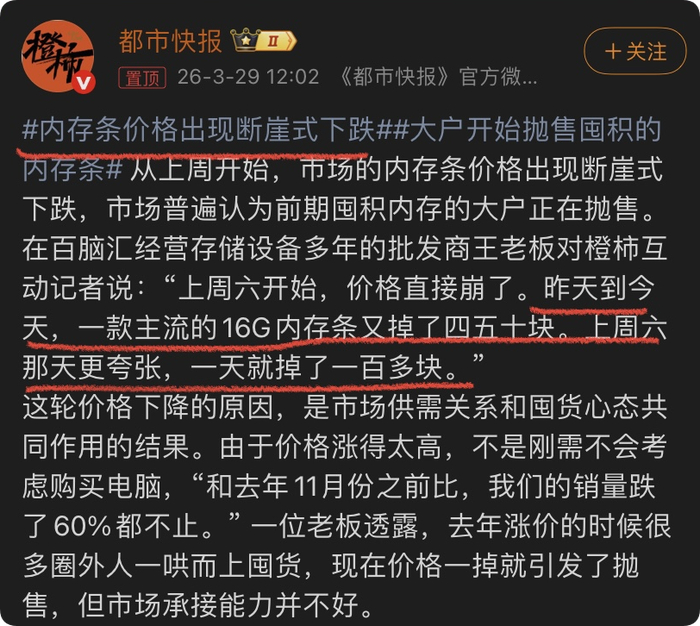 热评第一说的内存类型/价格,和「都市报道」微博中的不一样,但这不影响网友们对「断崖式下跌」的吐槽。