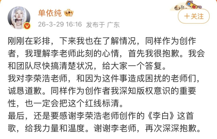 单依纯致歉,李荣浩再发声