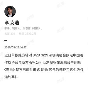 随后,李荣浩再次发文,确认中国著作权协会没有就《李白》发放任何授权。李荣浩四连质问单依纯:“请问你用什么立场、什么权利、什么角度、什么心态演唱?”
