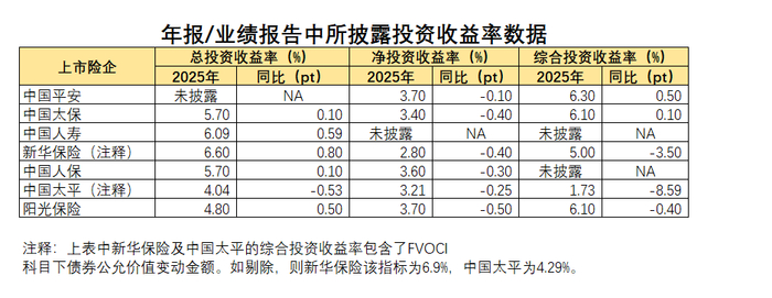 而同一家险企的相关披露或口径也会悄悄发生变化。例如中国人寿在2024年年报中还披露了净投资收益率,但到了2025年这一指标却消失在了年报中。根据东吴证券测算,中国人寿2025年净投资收益率为3.0%,同比下降0.4个百分点;中国人保2025年的总投资收益率看似同比上升0.1个百分点,但该公司在注释“小字”中披露,2025年该指标口径发生变化,重述的2024年指标提升了0.2个百分点。也就是说,在可比口径下其实该公司2025年总投资收益率实则下降了0.1个百分点。