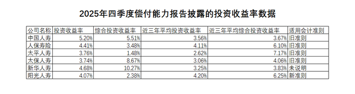 记者查阅了这7家上市寿险公司(寿险资金占据险资的大部分)2025年第四季度偿付能力报告的投资收益率指标,除平安人寿还未披露该季度报告、阳光人寿适用新准则、新华人寿未说明适用准则外,其他4家之中,中国人寿投资收益率最高,为5.2%,人保寿险为4.41%,太平人寿和太保寿险分别为3.76%及3.74%;而在险企更为看重的近三年平均投资收益率指标中,太平人寿的2.62%在上述4家险企中最低,而人保寿险的4.11%则最高。
