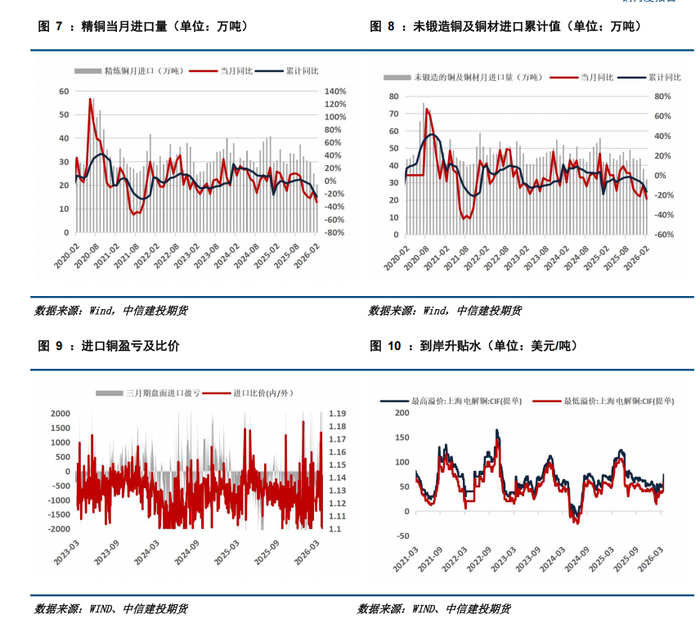 2026年2月铜矿进口量约493.35万吨,同比增长4.92%,2月精炼铜进口量约20.35万吨,同比减少33%,环比下滑18.8%,1-2月精炼铜累计进口量同比减少24.58%。3月份,受地缘冲突影响,美元强势反弹,人民币兑美元承压贬值,沪伦铜比走强运行至7.8-8.0区间,进口盈利窗口打开。