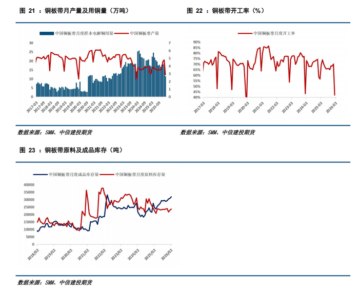 需求不振拖累,铜管表现低迷。铜管方面,2月份SMM中国铜管产量约13.37万吨,环比减少19%,同比减少15.5%。终端方面,2月份产业在线家空产销同比增速均约-0.2%。1-2月家空产销量累计同比增速分别为-1.9%、-3.5%,主要与同期国补政策推动的市场高基数、国际局势动荡限制出口市场等因素有关。受3月中东战事发酵影响,家空出口排产较前期规划明显下修,海外客户因运费涨价或船司增收费用取消或推迟订单,据产业在线,4月家空排产增速为-4.9%(上一次预测为2.9%),同时5月、6月排产同比增速预期分别调整为6.3%(上一次预测为4.9%)、10.5%。
