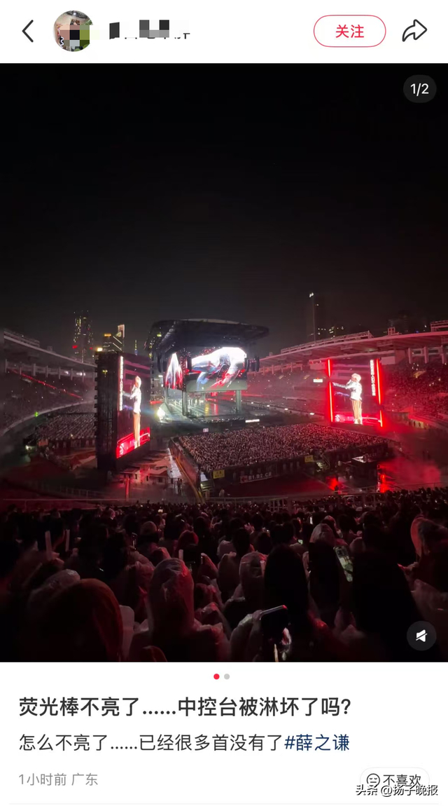 据现场歌迷反映,因广州下午突发大雨,演唱会开始大约一小时后,现场部分灯光和荧光棒接收设备受到影响出现故障。