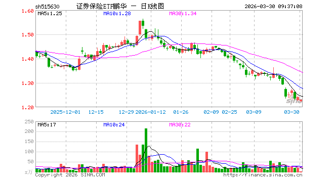 证券保险ETF鹏华(515630)开盘跌1.37%,重仓股中国平安跌1.07%,东方财富跌1.51%