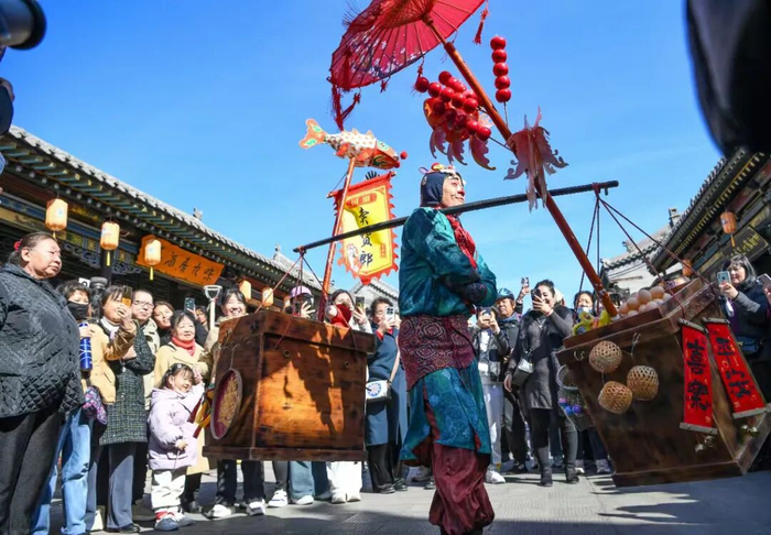 青砖黛瓦,红灯高悬,太原古县城里,一位肩挑扁担、头戴虎头帽的“卖货郎”成了这个春天最火的风景。