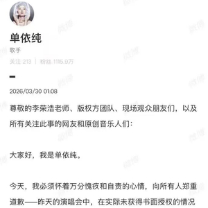 今天凌晨1点08分,单依纯发长文道歉,她称此次巡演的曲目版权审核、授权申请等工作,均由主办公司全权负责,自己演出前未进一步核实授权文件细节,之后才得知主办方实际并未签署《李白》的表演授权。“但我仍需为自身‘未亲自核查授权文件’的监督疏忽负责。”