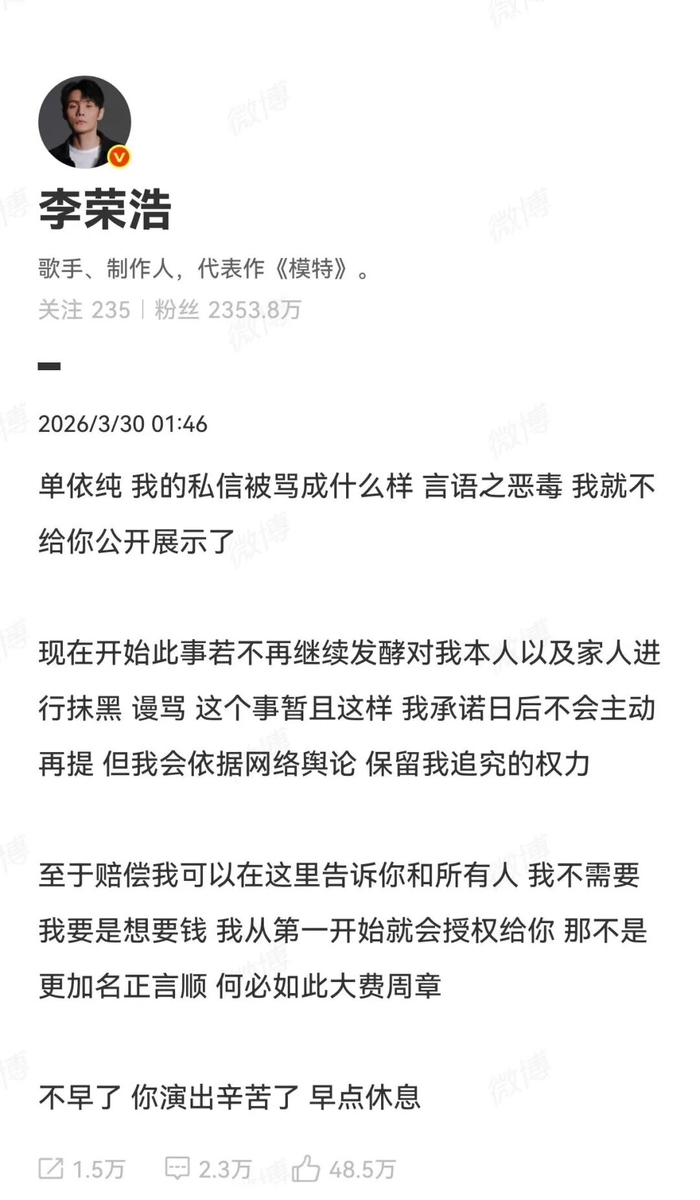 3月29日,李荣浩公开指控单依纯在深圳演唱会未经授权翻唱《李白》,此事不断发酵。3月30日凌晨1点08分,单依纯发文道歉,随后,1点46分,李荣浩发微博喊话单依纯。