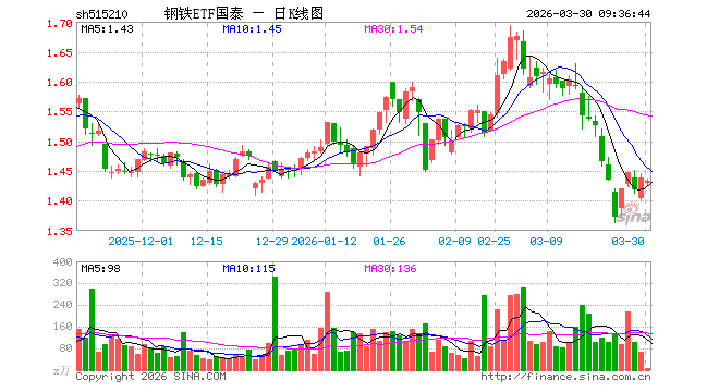 3月30日,钢铁ETF国泰(515210)开盘跌0.63%,报1.430元。钢铁ETF国泰(515210)重仓股方面,宝钢股份开盘跌0.62%,包钢股份跌1.18%,久立特材跌1.12%,华菱钢铁跌0.96%,中信特钢跌0.06%,大中矿业涨0.35%,南钢股份涨0.19%,太钢不锈跌0.68%,杭钢股份跌1.58%,沙钢股份跌1.45%。