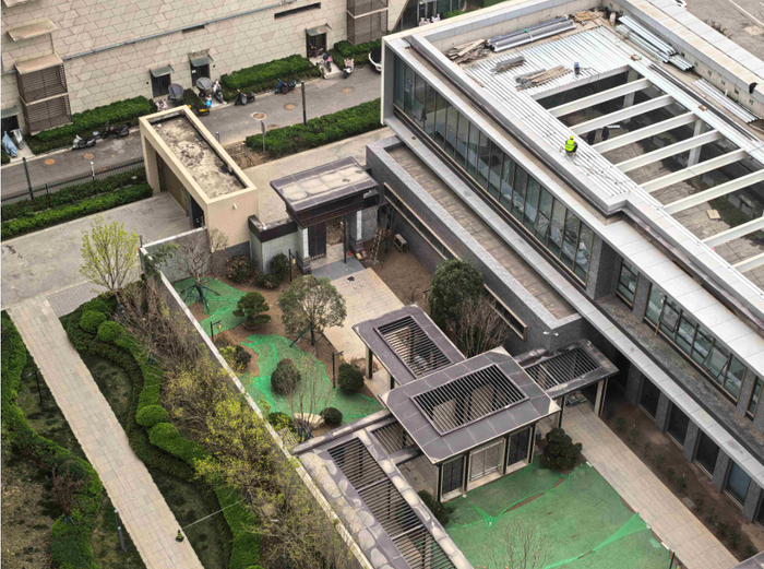 记者从附近高楼俯视,看到了31号建筑和围墙之间、已经基本建成的封闭四进花园全貌:从东边门楼进入后是第一进花园,里面中间道路做了硬化,南北两边土地上栽植有树木;第二进花园内四周做了硬化,中间是土地,用绿网覆盖着,地面高度明显要比第一进花园高;在第一进和第二进之间有游廊相连接。第三进花园内有水景、亭榭、小桥、花园、假山、石径等,有一处“地下室”一样的构筑,盖板掀开着,里面摆着一架梯子,连接着院落地面。在这进花园内靠近住宅小区围墙的区域被堆土填平后,栽植了树木、绿植,其高度明显比一墙之隔的小区内的绿地要高很多。可能也正是因堆土太厚,所以才需要加高小区围墙,否则从小院内看小区就没有了围墙边界。第四进院子向西到尽头后朝南拐向31号建筑的西边,并转而和这座建筑前面的区域相连。
