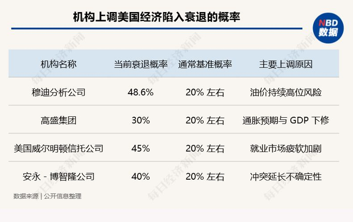 穆迪分析公司的最新模型显示,美国经济衰退概率已升至48.6%,创下近年新高。该公司首席经济学家马克·赞迪近期明确指出:“令人担忧的是,衰退风险高到令人不适且还在继续升高,经济衰退已是一个真实威胁。如果当前的高油价持续到5月下旬至二季度末,美国经济将陷入衰退。”