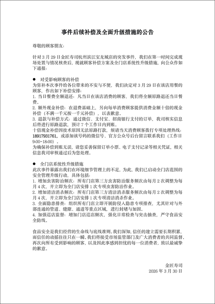 30日,金匠寿司官方账号又发布《事件后续赔偿及全面升级措施的公告》:
