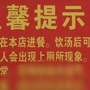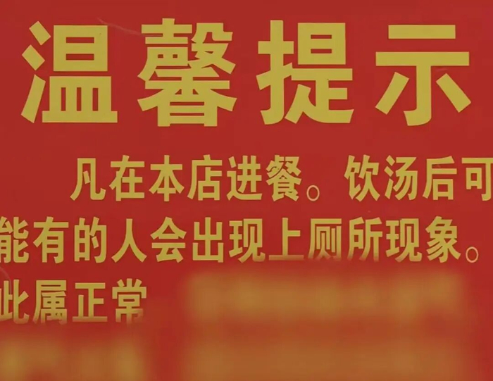 该饭店墙上张贴“在本店饮汤后可能会出现上厕所现象,此属正常”耿直提示标语,引发网友热议。