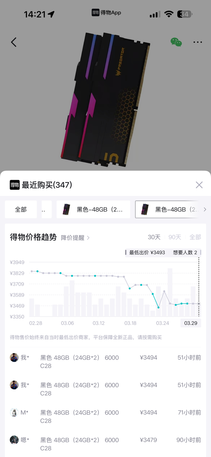 不过,尽管产品价格大幅回落,消费市场却呈现出“价跌量滞”的尴尬局面,“买涨不买跌”的心理成为抑制需求的主要因素。有得物商家表示:“最近半个月,内存条价格下降较多,消费者一看价格一直下跌,就选择继续观望。”有商家将宏碁掠夺者DDR5(32GB)内存条的价格由3399元降至当前的2309元,下降了1090元,但成交量依然较少。