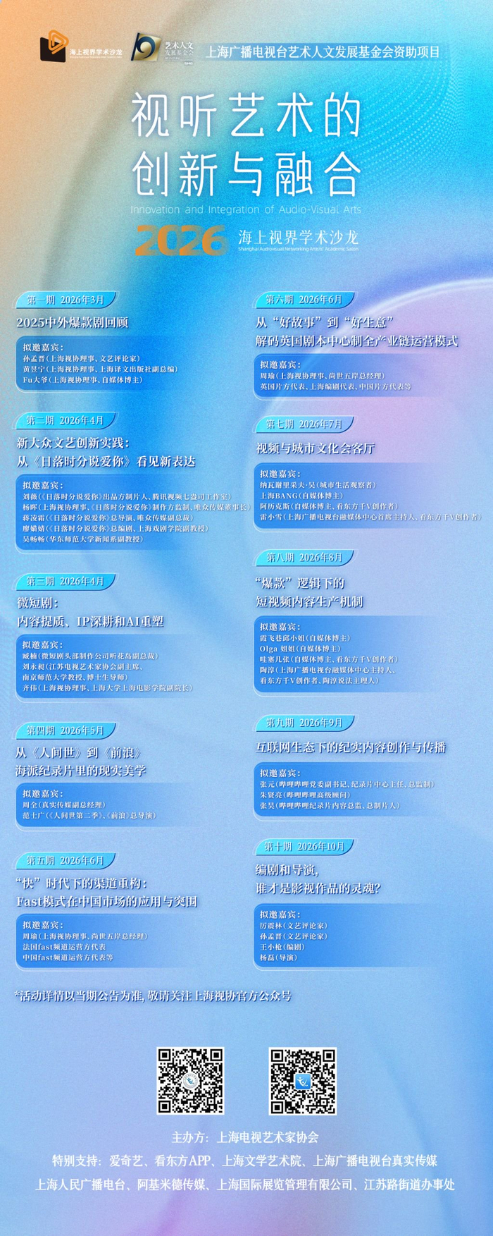 2026年度“海上视界学术沙龙”以“视听艺术的创新与融合”为主题,后续九期沙龙将围绕多元前沿议题展开深度探讨,涵盖微短剧的内容提质与IP深耕及AI技术赋能、海派纪录片的现实美学表达、算法驱动下短视频的内容生产机制、互联网生态下的纪实内容创作与传播,以及编剧与导演在影视创作中的核心协作关系等核心方向,同时聚焦新大众文艺的创新实践、Fast模式在中国市场的应用前景、英国编剧中心制的产业链运营逻辑、视频内容与城市文化空间的融合路径等热点话题。这场关于长剧“慢功夫”的对话,只是一个开始。