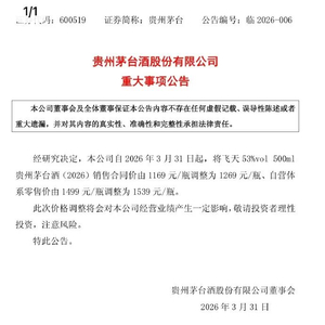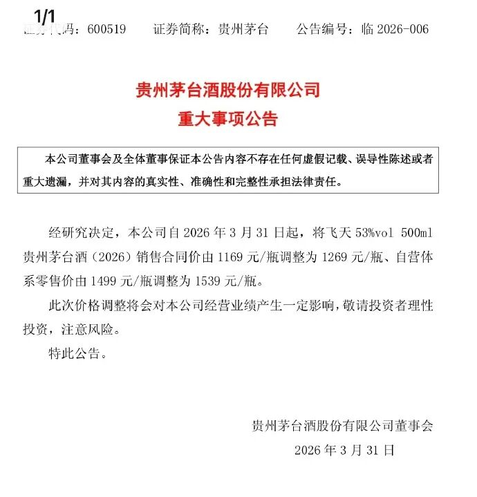 3月30日晚,贵州茅台发布公告称:自2026年3月31日起,将飞天53%vol 500ml贵州茅台酒销售合同价由1169元/瓶调整为1269元/瓶、自营体系零售价由1499元/瓶调整为1539元/瓶。