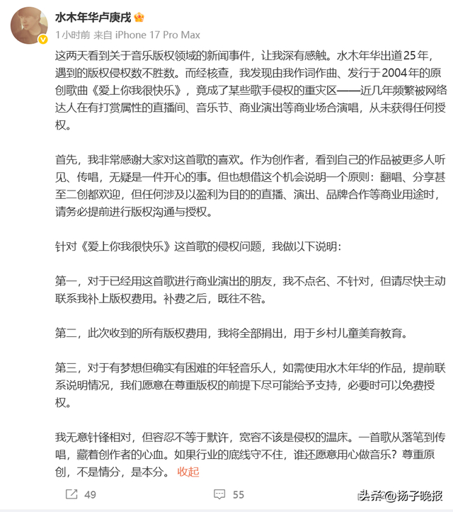 3月30日,歌手@水木年华卢庚戌 发布博文,喊话侵权其原创歌曲《爱上你我很快乐》的人: