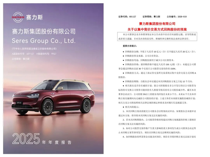 同时,公司拟每股派发现金红利0.8元(含税),2025年合计现金分红19亿元(含税),分红比例占归母净利润的31.9%。此外,赛力斯公告,公司拟用自有资金不低于10亿元(含)且不超过20亿元(含)回购股份,用于减少公司注册资本。