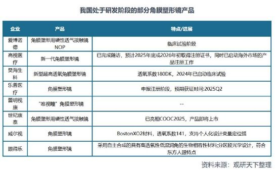 在此背景下,角膜塑形镜赛道也变得异常拥挤。从曾经的少数几家发展到如今的20多家,国内已获批角膜塑形镜或超24款,仅2025年前4个月就有3款产品获批。爱博诺德、高视医疗、昊海生科、乐普医疗、蕾明视康、世纪康泰、威尔视、眼得乐等企业的角膜塑形镜新产品处于研发中,未来产品数量还将进一步扩容。