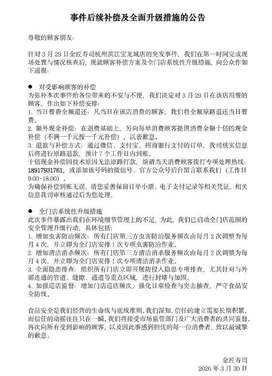 “针对3月29日金匠寿司杭州滨江宝龙城店的突发事件,我们在第一时间完成现场处置与情况核查后,现就顾客补偿方案及全门店系统性升级措施,向公众作如下通报: