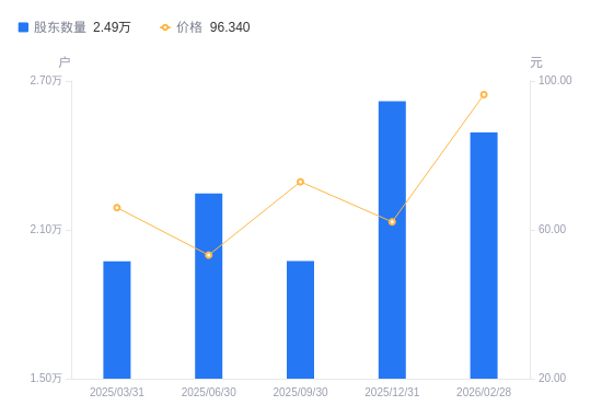 近一年(2024年12月31日至2025年12月31日),帝尔激光A股股东户数从2.13万户,增加至2.62万户,增幅23.18%,区间股价下跌5.32%。