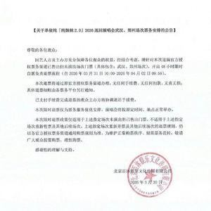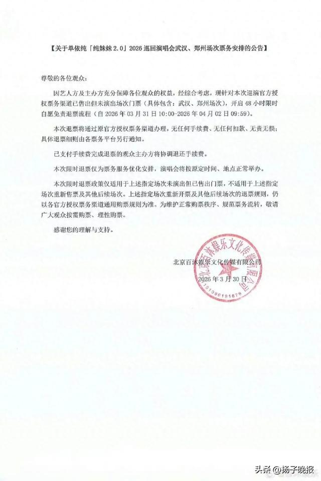 3月30日晚,百沐娱乐发布票务声明,表示因艺人方及主办方充分保障各位观众的权益,经综合考虑,现针对本次巡演官方授权票务渠道已售出但未演出场次门票(具体包含:武汉、郑州场次),开启48小时限时自愿免责退票流程(自2026年03月31日10:00—2026年04月02日09:59)。本次限时退票仅为票务服务优化安排,演唱会将按原定时间、地点正常举办。