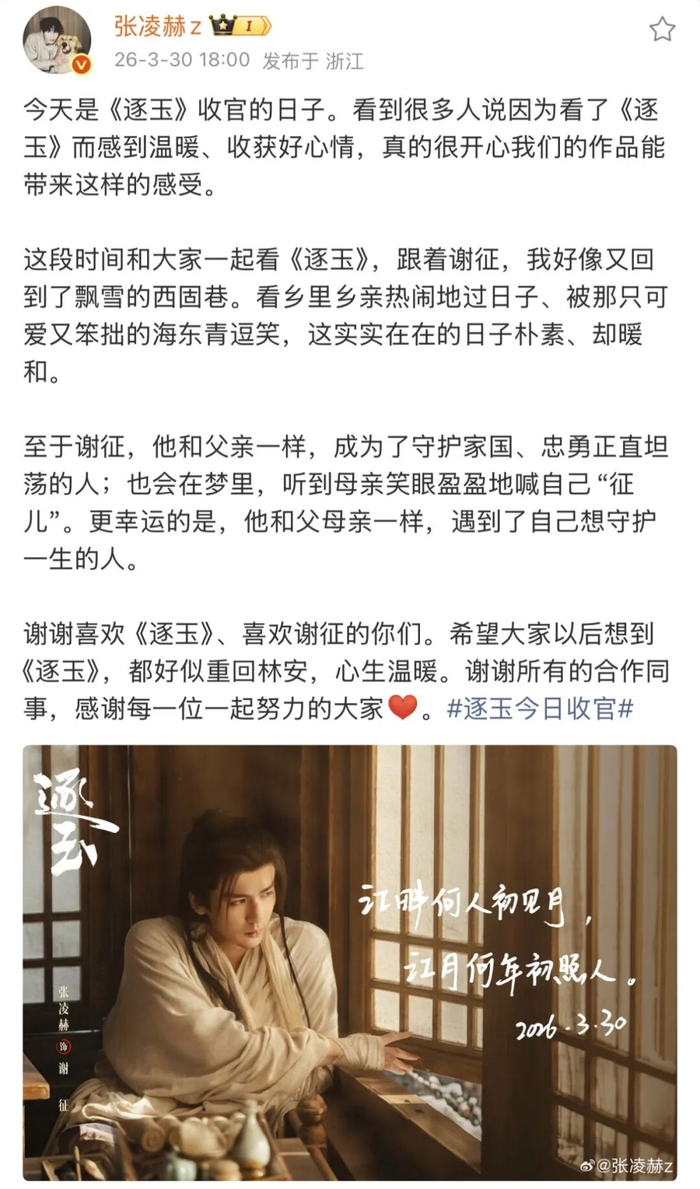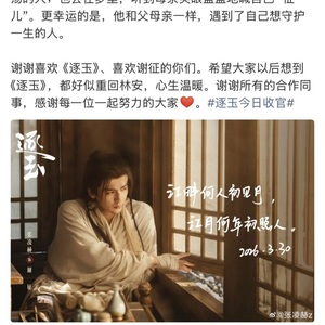 谢谢喜欢《逐玉》、喜欢谢征的你们。希望大家以后想到《逐玉》,都好似重回林安,心生温暖。谢谢所有的合作同事,感谢每一位一起努力的大家。