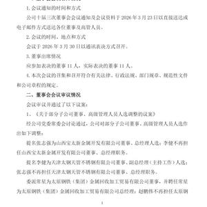 ●山西宝太新金属:提名张志强任董事、总经理;李健卸任 。宝太新为太钢不锈与宝钛股份合资(太钢持股49%),主营钛及不锈钢新材料技术开发,是太钢布局高端金属材料的重要平台。●天津太钢天管:提名李健任董事、副总经理(主持工作);张志强卸任 。天津天管是太钢沿海重要不锈钢生产基地,年产40万吨冷轧不锈钢板,区位与产能优势突出 。●太钢金属回收:委派常星任董事、总经理;赵鹏伟卸任 。该公司聚焦冶金废料回收加工,是太钢降本增效、循环经济的关键环节。