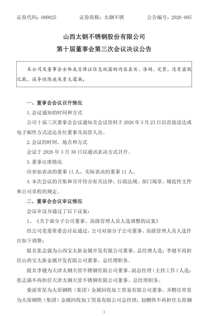 3月30日晚间,山西A股龙头太钢不锈(000825)发布公告,对旗下三家重要子公司核心管理层进行集中调整 。《晋才晋商》注意到,此次调整并非简单人事更替,更像是一次精准的资源调配与战略卡位。