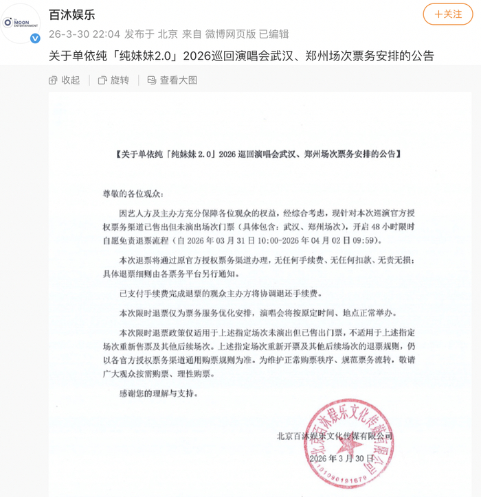 3月30日深夜,单依纯2026巡演的主办方北京百沐娱乐文化传媒有限公司(以下简称“百沐娱乐”)发布公告称,经综合考虑,针对单依纯此次巡回演唱会官方授权票务渠道已售出但未演出场次门票(包含武汉、郑州场次),开启48小时限时自愿免责退票流程。