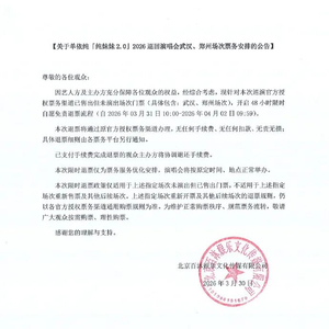 因艺人方及主办方充分保障各位观众的权益,经综合考虑,现针对本次巡演官方授权票务渠道已售出但未演出场次门票(具体包含:武汉、郑州场次),开启48小时限时自愿免责退票流程(自2026年03月31日10:00分—2026年04月02日09:59分)。