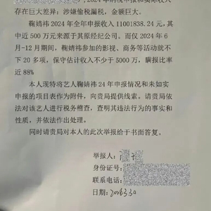 名为“实名举报信”上的内容显示,实名举报者提到,鞠婧祎在2024年全年申报收入1100余万元纳税,但“仅2024年6月-12月期间,鞠婧祎参加的影视、商务等活动就不下20多项,保守估计收入不少于5000万。”举报人称,鞠婧祎瞒报比率达88%。
