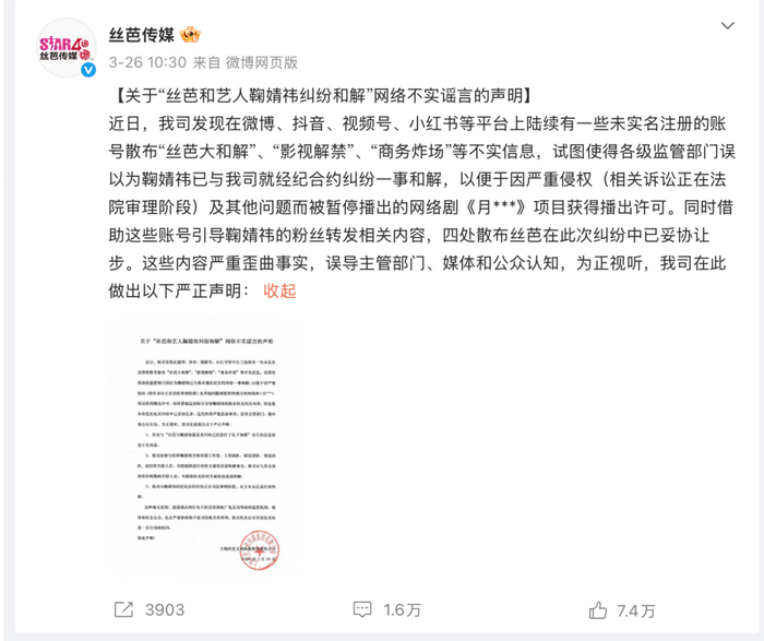 3月26日,丝芭传媒发布《关于“丝芭和艺人鞠婧祎纠纷和解”网络不实谣言的声明》,其中提到,丝芭未曾与任何鞠婧祎方的所谓工作室、工作团队、剧宣团队、网宣团队,或任何关联人员、关联组织进行任何方面的谈和解事宜。